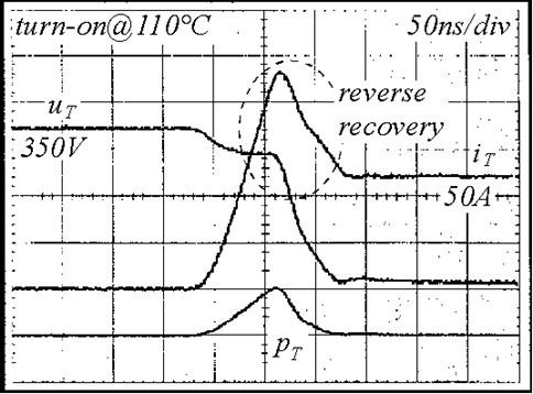 Turn-on at high temperature represents a worst case concerning losses. The reverse recovery current from the diode causes loss in the transistor. Therefore, switching losses are always characteristic for a combination transistor – diode.