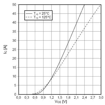 The graph “Output characteristic IGBT-inverter (typical) at VGE=15V” from the datasheet, shown in figure 3, tells us about the conduction loss of one IGBT for two different junction temperatures (25°C and 125°C).