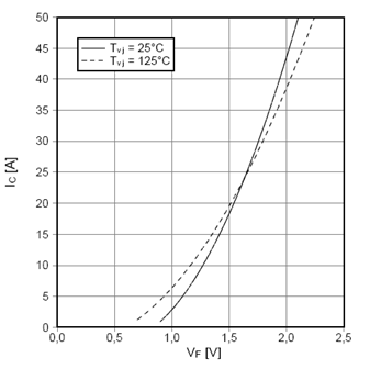 Finally, the losses of FS25R12YT3 ‘s internal diodes are described by the characteristic shown in figure 5. Switching losses of the diodes are neglected here.