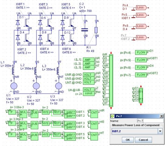 Figure 7 shows how the loss blocks (“Loss”, red) of GeckoCIRCUITS are employed. After setting the IGBT characteristics (figure 6), double-click the loss-block to select a semiconductor. Figure 7 also displays an open dialog of Loss-block Pv.7, where IGBT.2 is being selected from a drop-down list of all available power semiconductors.