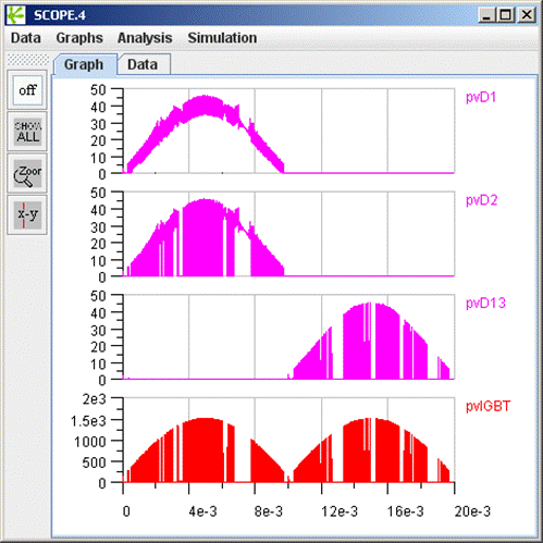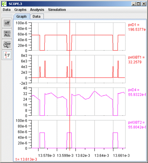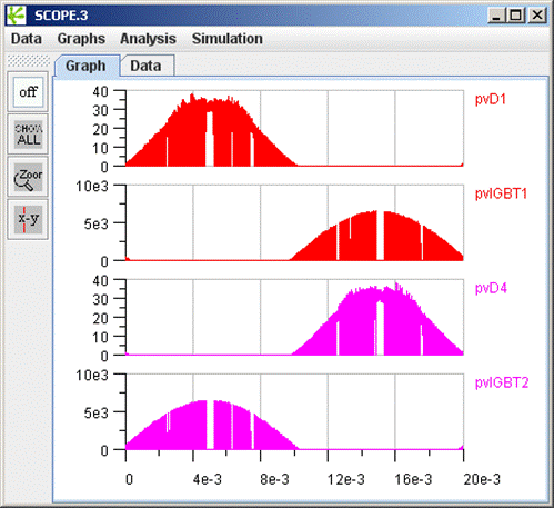 If you run the simulation, you will get a result like the one shown in figure 8 for the transient losses of the two IGBTs and the two diodes in the first bridge leg.