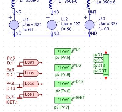 Figure 11 shows how to integrate loss measurement into the Vienna Rectifier model. When we parameterize the power diodes and IGBTs of the Vienna Rectifier with these values, we can simulate transient losses as shown in figure 12.